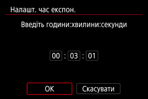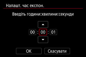 Тривалість експонування для зйомки з ручною витримкою можна встановити заздалегідь. За використання цієї функції не потрібно утримувати натиснутою кнопку затвора протягом зйомки з ручною витримкою, що допомагає зменшити тремтіння камери.