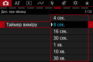 Можна встановити тривалість роботи таймера виміру (який визначає тривалість відображення величини експозиції / фіксації AE) після його ввімкнення, наприклад натисканням кнопки затвора наполовину.