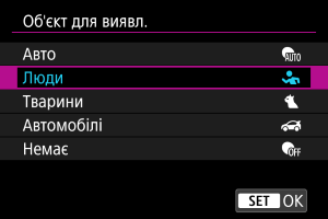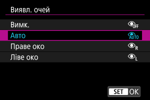 Якщо встановити для параметра [: Виявл. очей] значення, відмінне від [Вимк.] (), можна знімати об’єкт, так щоб його очі були у фокусі.
