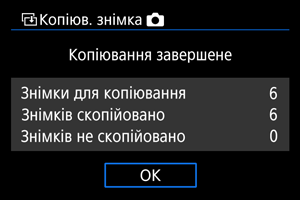 Якщо в папці призначення або на карті пам’яті вже міститься зображення з таким самим номером файлу, відображатимуться повідомлення [Пропустити знімок та продовжити], [Замінити існуючий знімок] і [Скасувати копіювання]. Виберіть спосіб копіювання й натисніть