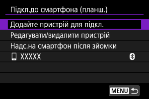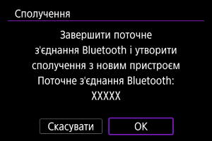 - Камеру неможливо підключити через Bluetooth до двох або більше пристроїв одночасно. Про зміну підключення до іншого смартфона через Bluetooth див. Повторне з’єднання через Wi-Fi / Bluetooth.