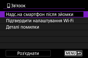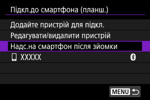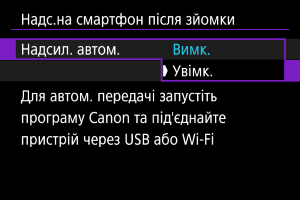 Знімки можна надсилати на смартфон автоматично. Перед виконанням цих вказівок переконайтеся, що з’єднання через Wi-Fi камери та смартфона завершено.