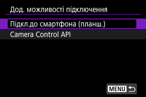 Перед тим як використовувати програму чи інший продукт, у яких застосовується Camera Control API (CCAPI)*, підготуйте камеру для керування CCAPI, підключивши її до смартфона, планшета або комп’ютера, що буде використовуватися.