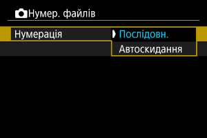 Зверніть увагу, що нумерація файлів може продовжуватися від будь-яких наявних зображень на картах або в папках, до яких виконано перехід. Якщо потрібно застосувати послідовну нумерацію, рекомендується завжди використовувати щойно відформатовану карту пам’яті.