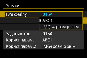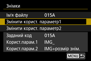 Користувацький параметр 1 дає змогу зареєструвати чотири символи на ваш вибір. Користувацький параметр 2 додає три початкові зареєстровані символи на ваш вибір до четвертого символу, що означає розмір зображення, який автоматично додається після зйомки.