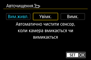 - Якщо встановлено значення [Вим.живл.] або [Увімк.], сенсор очищається, коли екран вимикається, зокрема і під час автоматичного вимкнення.
