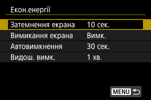 - [Затемнення екрана] і [Вимикання екрана] застосовуються під час відображення екрана зйомки. Ці параметри не застосовуються під час відображення меню або відтворення зображень.