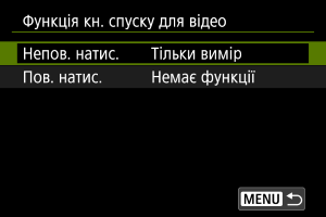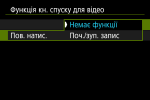 - Під час відеозйомки значення параметра [Функція кн. спуску для відео] матиме пріоритет над будь-якою функцією, призначеною для кнопки затвора в меню [