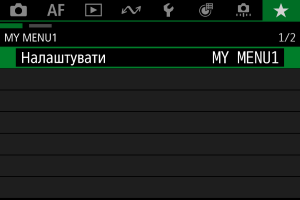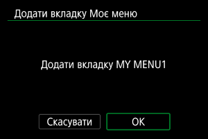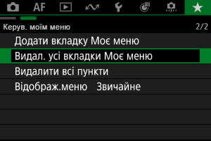 Можна видалити всі створені вами вкладки «Моє меню». Якщо вибрати [Видал. усі вкладки Моє меню], усі вкладки від [MY MENU1] до [MY MENU5] буде видалено та відновлено налаштування вкладки [] за замовчуванням.