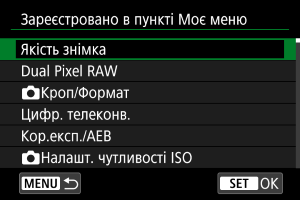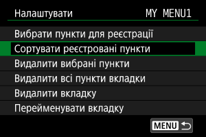 Усі пункти, зареєстровані на вкладках від [MY MENU1] до [MY MENU5], можна видалити. Самі вкладки залишаться. Якщо вибрати [Видалити всі пункти], усі пункти, зареєстровані на створених вкладках, буде видалено.