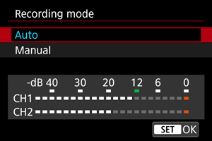 You can adjust the sound-recording level as needed. Adjust the level in [Rec. level].