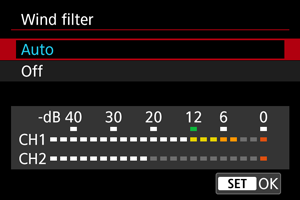 Available when using the built-in microphone or multi-function shoe microphones that are compatible with wind filters.