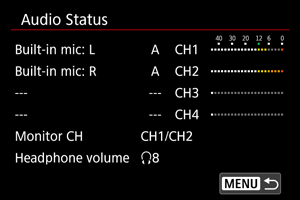 - [Monitor CH] indicates channels set in [Shoot. monitor CH] for [Headphones] in [