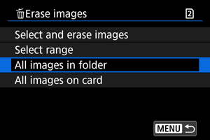 : Erase images], all the images in the folder or on the card will be erased.