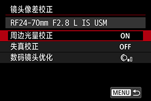 - 使用非佳能镜头时,即使显示[存在校正数据],也建议将校正设为[关闭]。