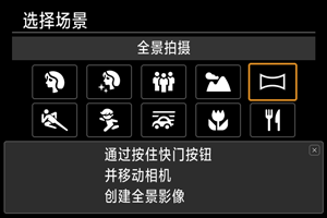 使用[] (全景拍摄)可以拍摄全景。在完全按下快门按钮期间,通过合成朝一个方向移动相机时连拍的照片来创建全景照片。