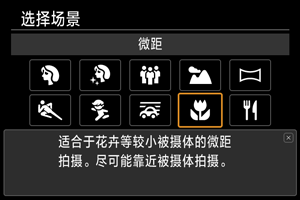 使用[] (微距)可拍摄花朵等较小被摄体的特写。要使小物体显得更大,请使用微距镜头(另售)。