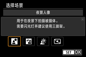 使用[] (夜景人像)可以在夜景环境下拍摄明亮、清晰的人物照片。请注意,在此模式下拍摄需要使用外接闪光灯。建议使用三脚架。