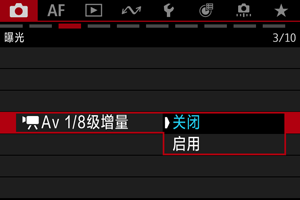 使用RF镜头记录短片时,可以按1/8级增量设定光圈值。在[