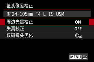 根据镜头光学特性,可能会导致暗角、图像失真和其他问题。通过使用[镜头像差校正],相机可补偿这些现象。