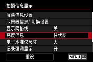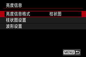 拍摄就绪状态下按按钮后,可以设定可用的亮度信息格式(柱状图或波形监视器)。