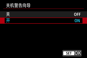 启动时会显示关机警告向导(在某些短片记录设置下,记录短片时由于内部温度过高而导致自动关机的情况)。如果不想显示关机警告向导,请将[
