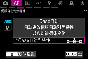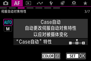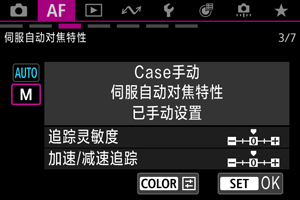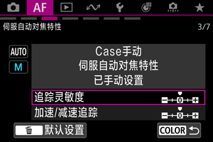 可以为被摄体和拍摄条件设定伺服自动对焦追踪参数(被摄体追踪灵敏度和加速/减速追踪)。