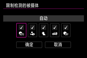 可以将[: 检测的被摄体]中的可用设置选项限制为偏好选项。选择要排除的选项,然后按