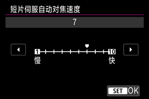 可以设定短片伺服自动对焦的自动对焦速度。此功能在以下情况下处于启用状态:在短片记录期间使用兼容慢速对焦转变的镜头且[: 短片伺服自动对焦]中的[短片伺服自动对焦]设定为[启用]时。*