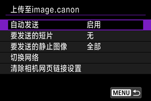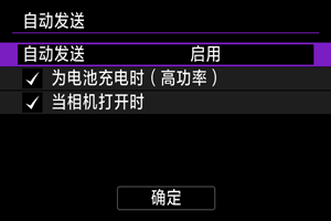 - [为电池充电时(高功率)]:自动发送将在相机关闭并连接到电源以通过USB充电时开始。请注意,如果最初的剩余电量较低,自动发送将在相机充电一段时间后开始。