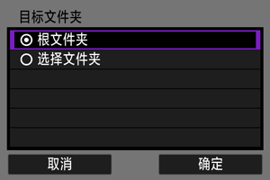 会在服务器根文件夹中自动创建与相机中一致的文件夹结构(例如A/DCIM/100EOSR6)来用于图像存储。如果已通过更改[目标文件夹]设置在根文件夹中创建了子文件夹,会在文件夹中自动创建例如A/DCIM/100EOSR6的文件夹结构来用于图像存储。