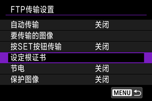 如果配置连接设置时指定[FTPS]FTP模式,必须将FTP服务器使用的根证书导入至相机。