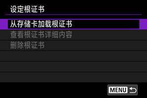 - 只有一个根证书文件可以导入至相机。事先插入包含根证书文件的存储卡。