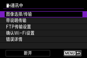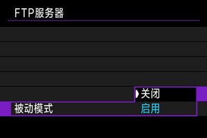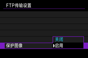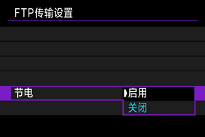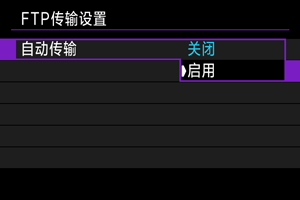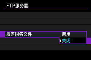 设定[启用]且一段时间内没有传输图像时,相机将从FTP服务器注销并断开Wi-Fi连接。相机图像传输再次准备就绪时,会自动重新建立连接。如果不想断开Wi-Fi连接,请设为[关闭]。