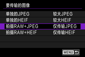 将不同大小的图像记录至两张存储卡时,或拍摄RAW+JPEG或RAW+HEIF图像时,可指定要传输的图像。