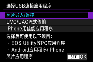 如果要在连接至计算机后使用EOS Utility,或要使用Android应用程序或iOS版的“照片”,请选择此项。
