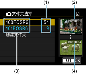 - 在屏幕上打开的存储卡中创建一个以“DCIM”命名的新文件夹。打开DCIM文件夹并根据需要创建多个文件夹以便保存和整理您的图像。“100ABC_D”为文件夹名称要求的格式,表示文件夹编号的前三个数字必须在100–999的范围内。最后五个字符可以由从A到Z的任意大写和小写字母、数字以及下划线“_”组成。不能使用空格。此外请注意,即使两个文件夹名称的最后五个字符不同,也不可使用相同的三位数文件夹编号(例如“100ABC_D”和“100W_XYZ”)。