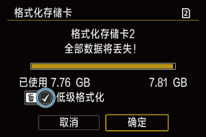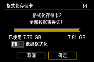 - 如果感觉存储卡的写入或读取速度较慢或如果想要彻底删除存储卡中的所有数据,请执行低级格式化。