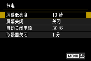 可以调整不操作相机后屏幕亮度降低并关闭的时间(屏幕低亮度、屏幕关闭)、相机关闭的时间(自动关闭电源)和取景器关闭的时间(取景器关闭)。