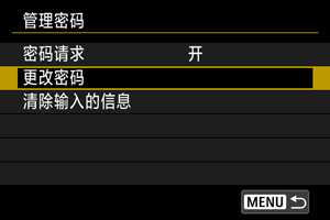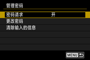 可以更改在电源开关置于时或相机从自动关闭电源恢复运行后需要输入的密码。