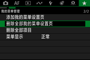 可以删除创建的全部我的菜单设置页。当选择[删除全部我的菜单设置页]时,从[MY MENU1]到[MY MENU5]的全部设置页将被删除,并且[]设置页将恢复为默认设置。