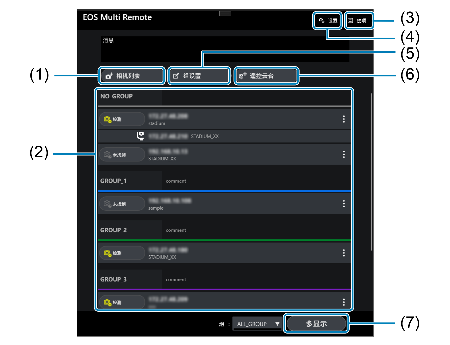 并排显示已注册的接收端相机信息。可以通过相机和组进行遥控拍摄和设置更改。