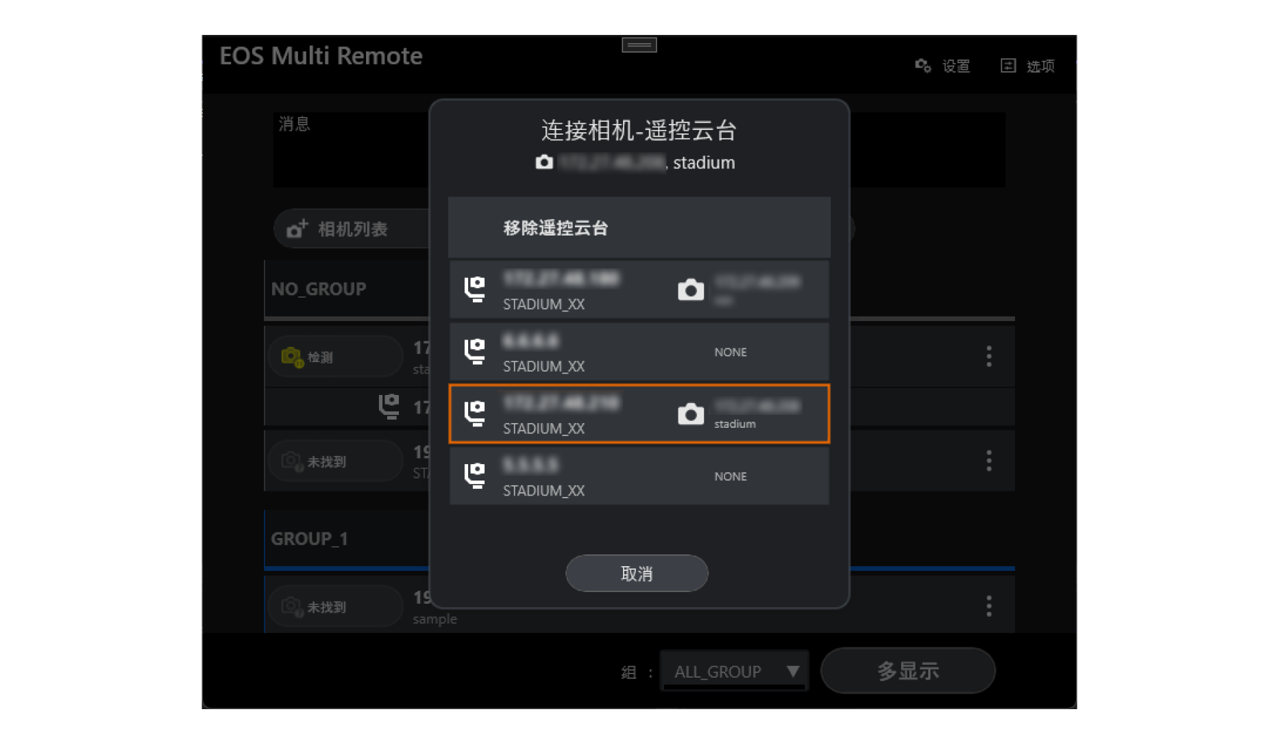 - (2)显示遥控云台的连接状态、IP地址和显示名称。