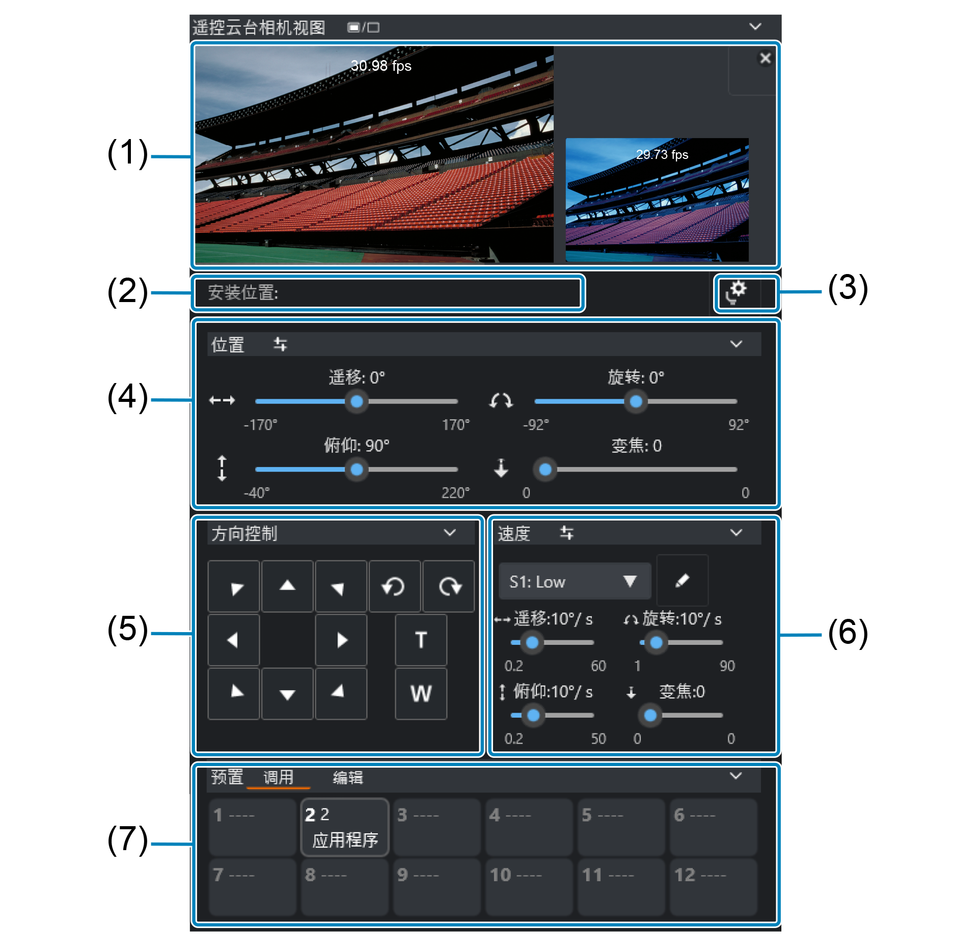 此外,还可以选择此应用程序([应用程序])或遥控云台([云台])作为预设记录位置。但是,记录至此应用程序时,当前位置的复位精度会低于记录至遥控云台时的精度。